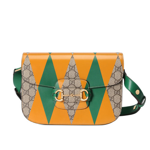 GUCCI/古驰 22新款Horsebit 1955系列 女士小号多色印花老花帆布配皮马衔扣金扣单肩斜跨包602204FAARG9754