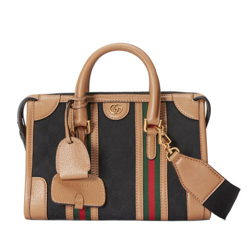 GUCCI/古驰 22新款Exquisite系列 女士小号黑色帆布配浅棕色皮革金扣饰红绿织细节拉链开合单肩手提包715772FAARB1041