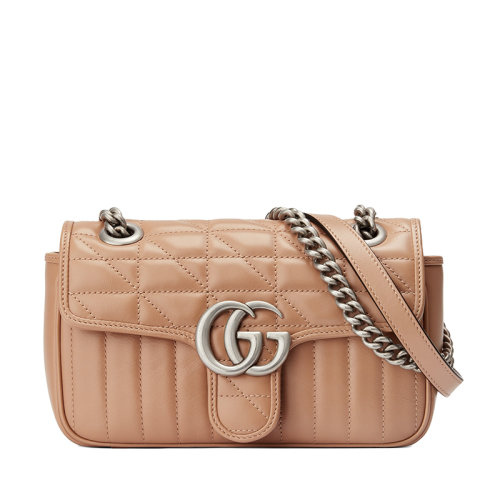 GUCCI/古驰 GG Marmont系列 女士迷你玫瑰米色绗缝皮革复古银饰双G翻盖斜挎单肩链条包446744UM8AN2754