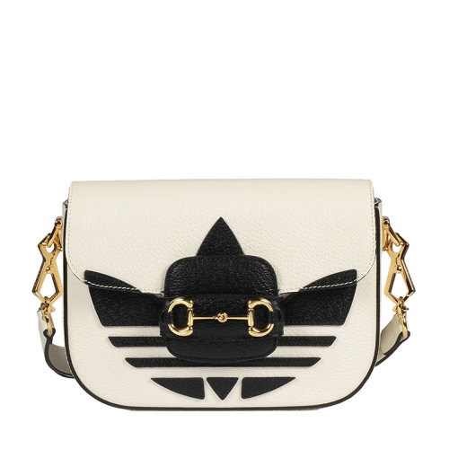 GUCCI/古驰 22新款阿迪达斯联名Horsebit 1955系列 女士迷你白色皮革饰黑色主题系列三叶草印花金扣配可拆卸红绿织物肩带单肩斜挎手提包658574U3ZDG8727
