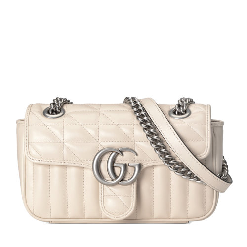 GUCCI/古驰 GG Marmont系列 女士迷你白色绗缝皮革复古银饰双G翻盖斜挎单肩链条包446744UM8AN9022