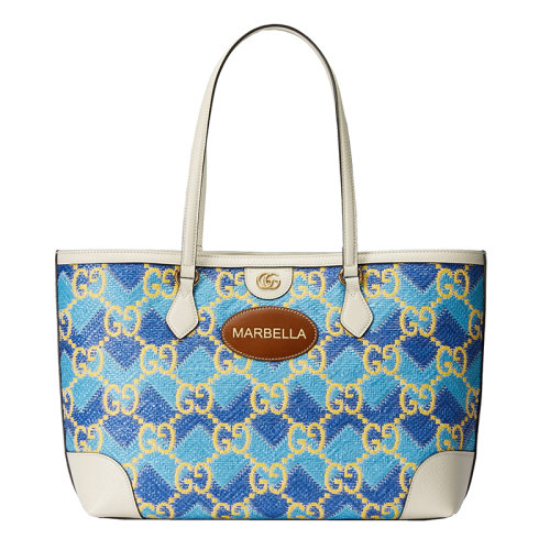 GUCCI/古驰 22新款 女士宝蓝色/蓝色稻草效果面料配皮革GG老花Marbella字样刺绣手提包托特包631685UYFBG8833
