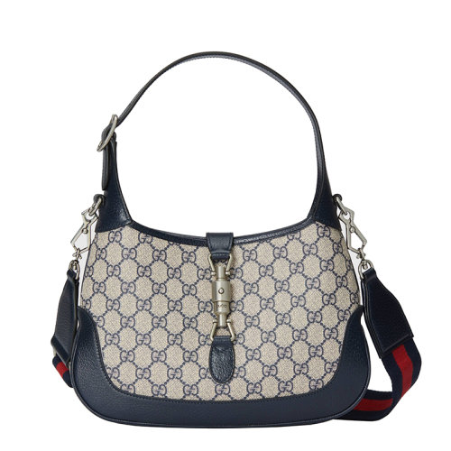 Gucci/古驰 22春夏新款Jackie 1961系列 女士小号米色/蓝色提花帆布配蓝色皮革红蓝肩带银扣老花单肩手提包 67884396IWN4076