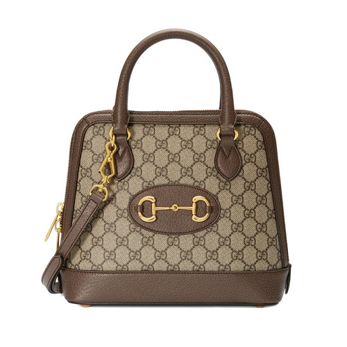 GUCCI/古驰 201955系列 马衔扣老花帆布拼接棕色皮革小号手提包 62122092TCG8563