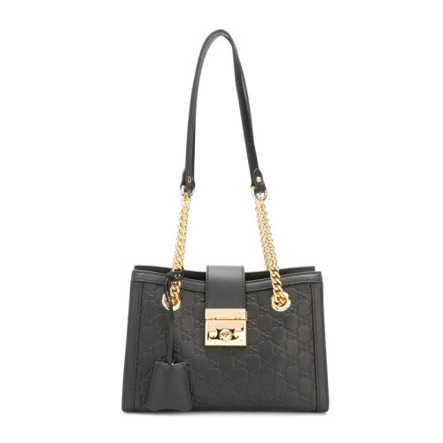 GUCCI/古驰 女士黑色牛皮经典双G字母徽标压花装饰单肩手提包购物包女包 498156-0REAG-1000