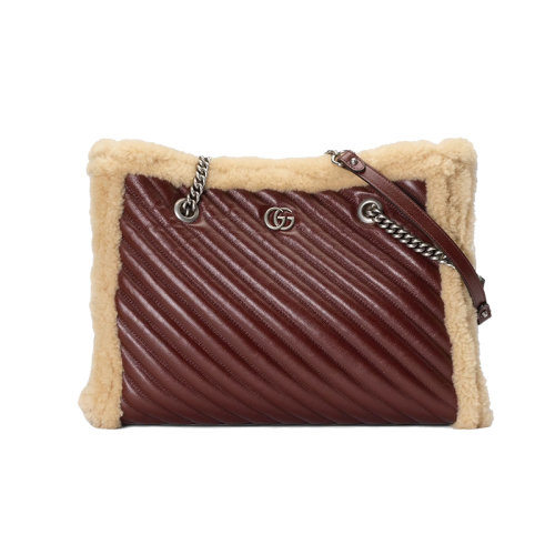 GUCCI/古驰 23春夏新款 Marmont系列 女士中号棕色皮革羊毛饰边钯饰面双G单肩托特包6757960AAAX6154