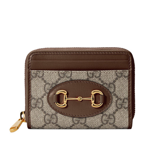 GUCCI/古驰 Horsebit 1955系列 女士米色乌木色GG帆布棕色皮革饰边马衔扣细节拉链卡包65854992TCG8563