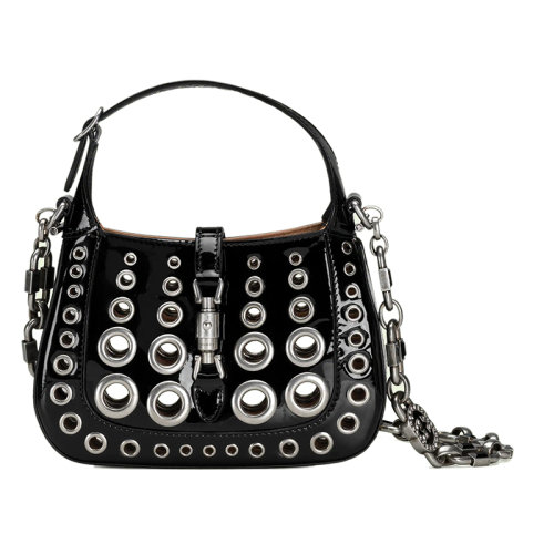 GUCCI/古驰 22新款 Jackie 1961系列 女士迷你黑色漆皮不同尺寸孔眼银色饰面朋克风单肩手提包6996511J7DN8180