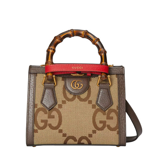 GUCCI/古驰 22春夏新款Diana系列 女士迷你驼色/乌木色老花帆布配棕色皮革竹节提手配红色饰带金扣单肩斜挎手提包 655661UKMFT2672