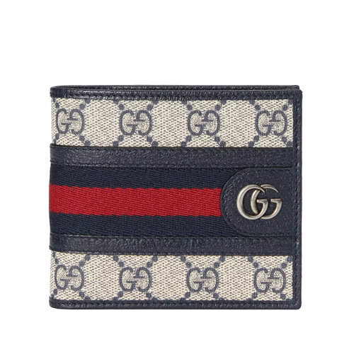 GUCCI/古驰 22春夏新款Ophidia系列 男士米色/蓝色老花帆布红蓝织带配蓝色皮革双G附零钱袋折叠钱包 59760996IWN4076