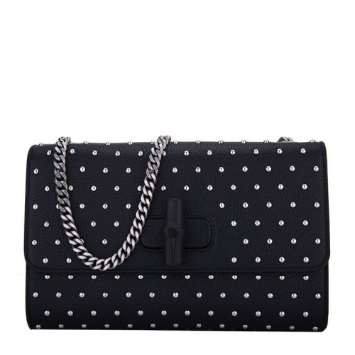 GUCCI/古驰 女士黑色皮革金属饰钉流苏装饰单肩包斜挎包链条包女包 387611-A88EN-1000