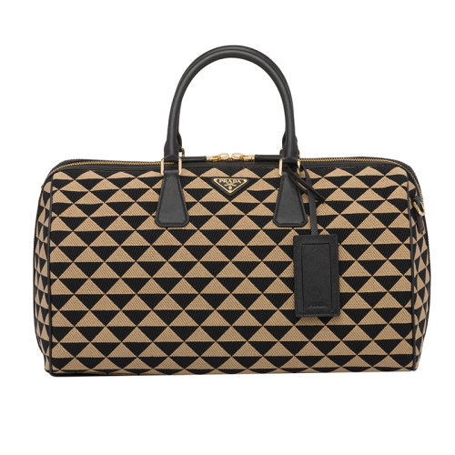 PRADA/普拉达 22新款Symbole系列 男士黑色/米色三角双色拼接效果织物配皮徽标金扣单肩手提包2VC034_2FKL_F0Y30_V_OOO