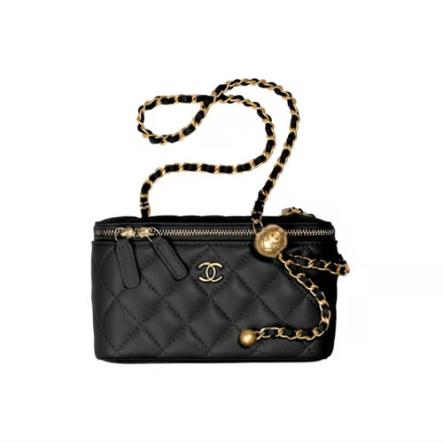 CHANEL/香奈儿 经典 Filigree Vanity Case浅米色和黑色鱼子酱皮 金色五金链条化妆箱包单肩包