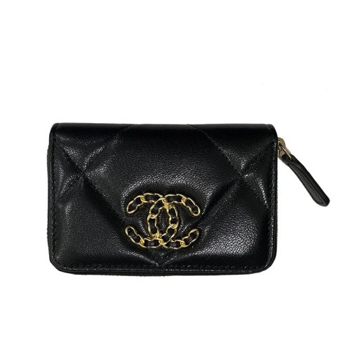 CHANEL/香奈儿 经典款19系列 女士黑色小牛皮菱格纹CC金扣拉链卡包钱包AP445112574116