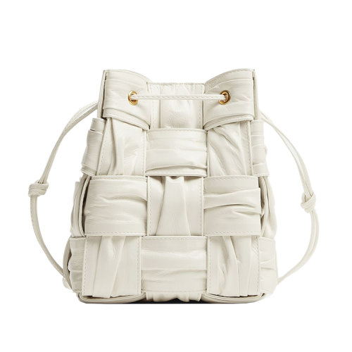 Bottega Veneta/葆蝶家 22新款 女士小号白色亮面羔羊皮抽绳封口金色饰面单肩斜挎水桶包717187V2FY39009