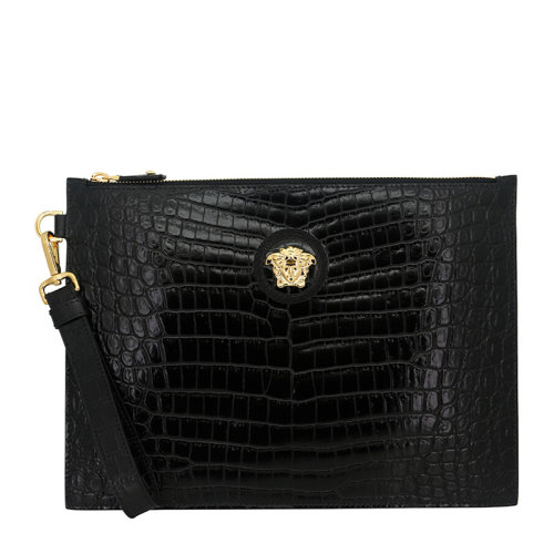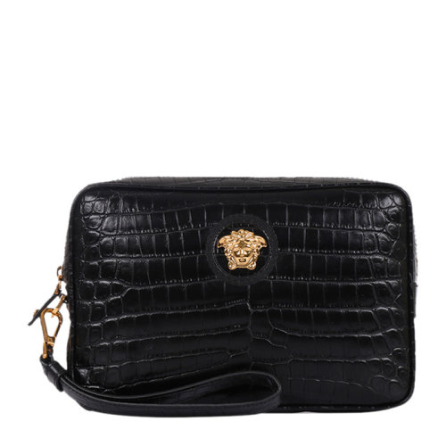 VERSACE/范思哲 男士黑色鳄鱼压纹牛皮美杜莎头像徽标拉链开合钱包卡包手包腕包手拿包男包 DP85102-DCOV4-D41OH