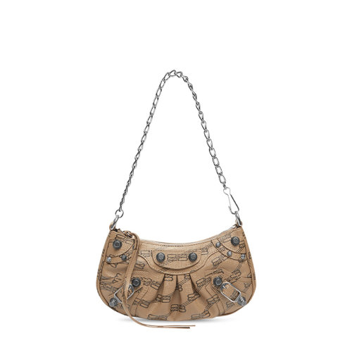 Balenciaga/巴黎世家 22新款LE CAGOLE系列 女士迷你米色/棕色褶皱效果帆布饰银色挂钩拉链开合单肩手提链条半月包695814210E72762
