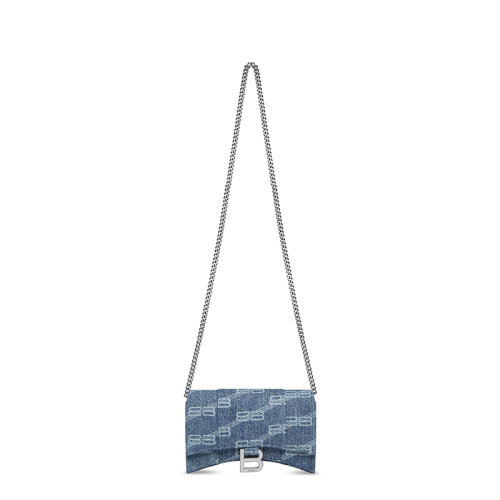 Balenciaga/巴黎世家 22新款Hourglass系列 女士小号蓝色褪色做旧效果牛仔布银扣单肩斜跨手提手拿沙漏链条钱包656050210E64716