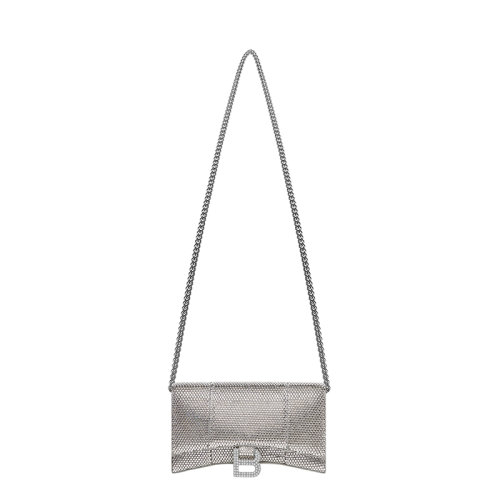 Balenciaga/巴黎世家 22新款HOURGLASS系列 女士灰色绒面小牛皮镶嵌水钻链条单肩斜挎手拿沙漏钱包65605028D0Y1272
