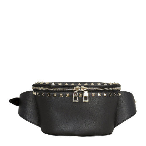 Valentino/华伦天奴 女士黑色皮革经典字母徽标印花铆钉装饰双向拉链开合腰包女包 RW2B0D15-BOL-0NO