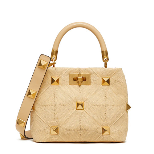 Valentino/华伦天奴 21新款 ROMAN STUD系列 女士小号自然色拉菲草柳丁金属扣单肩斜挎手提包WW2B0I97WEMO39