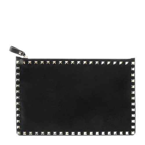 Valentino/华伦天奴 女士黑色牛皮经典字母徽标印花铆钉装饰拉链开合手拿包公文包女包 RW2P0269-BOL-0NO