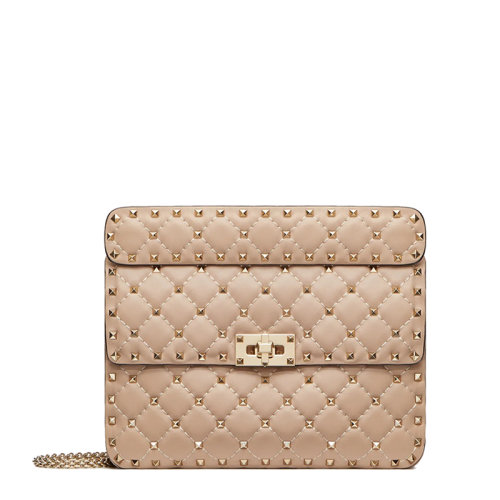 Valentino/华伦天奴 21新款 ROCKSTUD SPIKE系列 女士中号粉末色绗缝小羊皮旋转扣翻盖柳丁链条单肩斜挎包ZW2B0122NAPP45