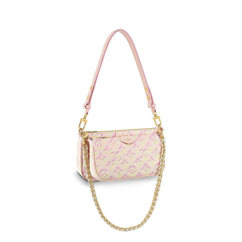 Louis Vuitton/路易威登 22新款MULTI POCHETTE系列 女士浅粉色老花压印粒面皮革金扣金链配可拆卸小袋二合一多功能单肩手提链条包M46093