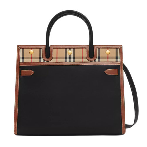 BURBERRY/博柏利 2020新款经典款Title系列 黑色中号皮革拼Vintage格纹双提柄泰尔勒手袋单肩手提包80246941