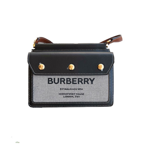 BURBERRY/博柏利 Title系列 女士迷你黑色/棕褐色帆布明线皮革Horseferry印花三按扣单肩斜挎手提包80428521