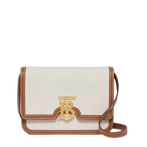 BURBERRY/博柏利 21新款 TB系列 女士小号自然色帆布/麦芽棕皮革饰边TB搭扣单肩斜挎包80393651