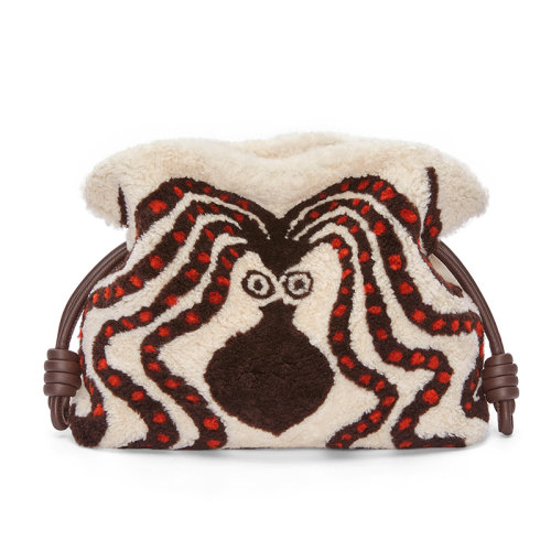 LOEWE/罗意威 23春夏新款 女士软白/巧克力色羊毛皮拉绳收紧磁扣开合章鱼图案单肩斜挎手拿包A411FC1X72-1001