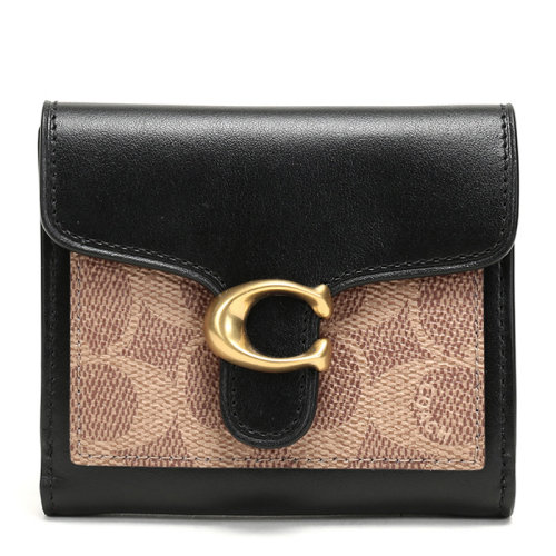 COACH/蔻驰 ABBY系列女士黑黄棕拼色涂层帆布配皮经典双C字母徽标印花图案按扣开合短款钱夹钱包卡包女包 85994B4OOH
