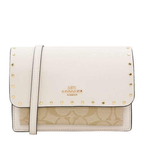 COACH/蔻驰 女士卡其配白色PVC配皮经典双C字母徽标印花铆钉装饰单肩包斜挎包风琴包腰包女包 C3326IMOT4