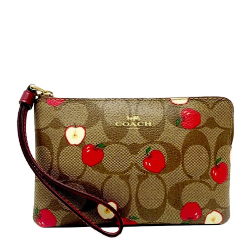 COACH/蔻驰 女士卡其配红色PVC配皮双C字母徽标苹果印花装饰拉链开合手拿包钱包手包腕包女包 F6979IME7V