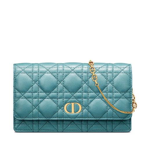 DIOR/迪奥 22新款Caro系列 女士天蓝色藤格纹柔软小牛皮CD金扣可拆卸金链单肩手拿链条钱包S5134UWHC_M08Z