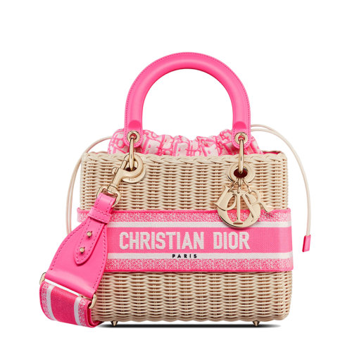 DIOR/迪奥 22新款LADY DIOR系列 女士中号柳条编织粉色老花抽绳设计小袋单肩斜挎手提包M0565OMVD_M956