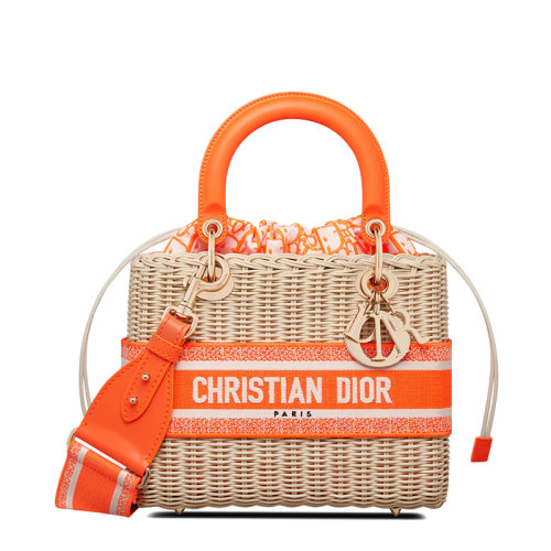 DIOR/迪奥 22新款LADY DIOR系列 女士中号柳条编织荧光橙色老花抽绳设计小袋单肩斜挎手提包M0565OMVD_M057
