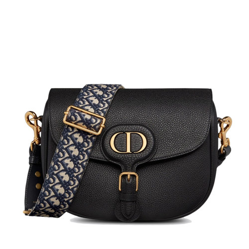 DIOR/迪奥 BOBBY系列 女士大号黑色粒面小牛皮蓝色Oblique刺绣帆布肩带斜挎单肩包M9320UBBY_M911