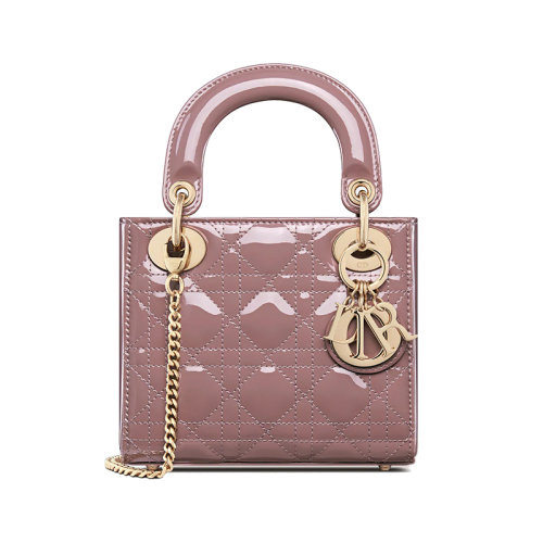 DIOR/迪奥 23新款 lady系列 女士迷你牡丹粉色漆皮小牛皮绗缝纹理浅金色金属字母吊饰拆卸调节链式肩带手提斜挎包M0505OWCB_M81P