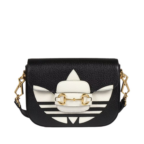 GUCCI/古驰 22新款Horsebit 1955阿迪达斯联名系列 女士迷你款黑色皮革三叶草印花翻盖马衔扣细节单肩斜挎包658574U3ZDG8726