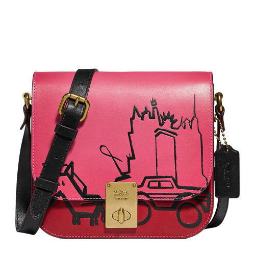 COACH/蔻驰 HUTTON系列女士玫红色小牛皮拼接涂层帆布抽象天际线马车涂鸦印花旋钮开合翻盖单肩包斜挎包马鞍包女包 5464B4RKK