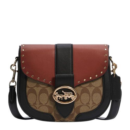 COACH/蔻驰Georgie系列女士拼色涂层帆布配皮经典马车徽标按扣开合单肩包斜挎包马鞍包女包 C3593IMRL7