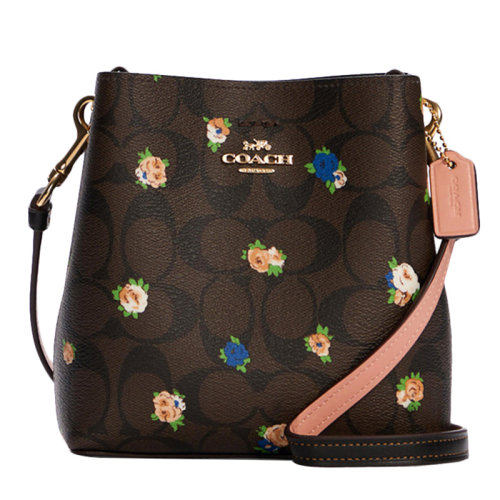 COACH/蔻驰 女士棕黑多色拼色涂层帆布配皮经典双C字母徽标玫瑰印花按扣开合复古迷你单肩包斜挎包水桶包女包 C7270IMOSN