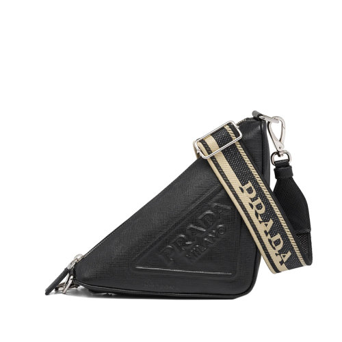 PRADA/普拉达 22年新款 男士黑色皮革编织黑色米色肩带拉链可调徽标印花三角形斜挎单肩包2VH5_2FAD_F0002_V_OOO