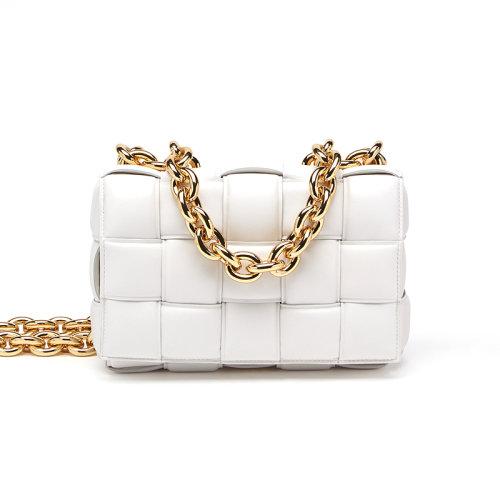 Bottega Veneta/葆蝶家 经典款CHAIN CASSETTE系列 女士白色小羊皮编织链条单肩斜挎豆腐包631421VBWZ09143