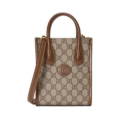 GUCCI|古驰 GG Retro 老花logo 皮革徽标 帆布拼皮 托特包 单肩斜挎手提包 迷你