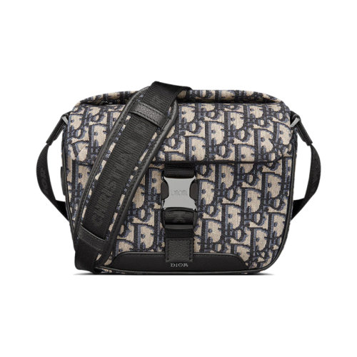 DIOR/迪奥 22新款 男士米色/黑色老花帆布配黑色粒面小牛皮搭扣开合尼龙提花调节肩带单肩斜挎包2ESWS001YKY_H27E