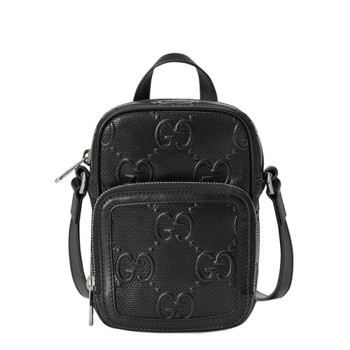GUCCI/古驰 GG embossé系列 男女同款迷你黑色双G压纹皮革拉链单肩斜挎手机包6585531W3AN1000