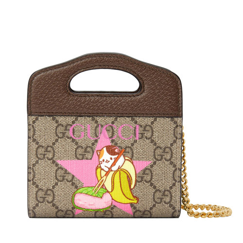 GUCCI/古驰 22新款 女士经典老花帆布棕色皮革滚边Bananya印花迷你手提包单肩斜挎链条包701066U2ZAG8679